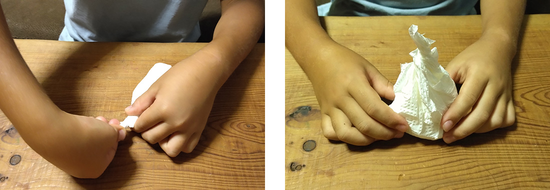1.ティッシュを山のように形づくり、キッチンペーパーで包み、上をキュッとひねります。