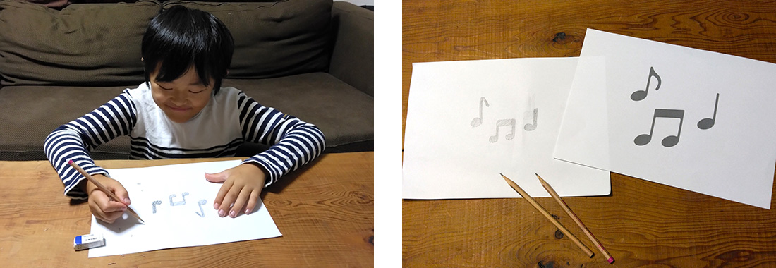 「ちゃんと覚えられるかなぁ~」と不安そうな息子でしたが、いざ始めてみると、音符の形に苦戦しながらもほぼ正確に描きだすことができました。