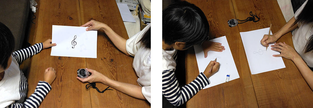 今回は音符のプリントを用意し、親子でトライしてみました。