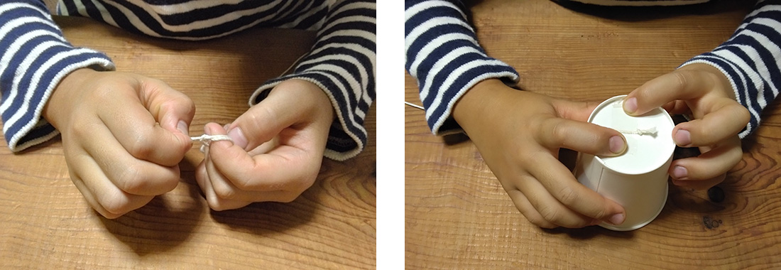 1.ひもの先を玉結びしたら、紙コップの底にセロハンテープで貼りつけます。
