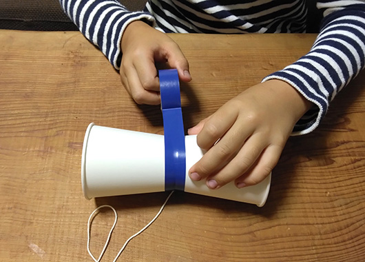 2.もう一つの紙コップと底同士を合わせ、ビニールテープでつなげます。