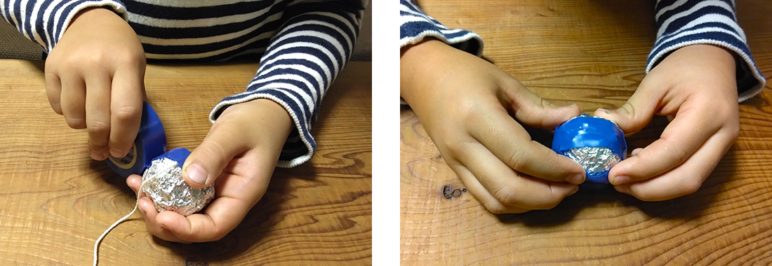4.その玉を、ひもの先にビニールテープで巻いてとめます。