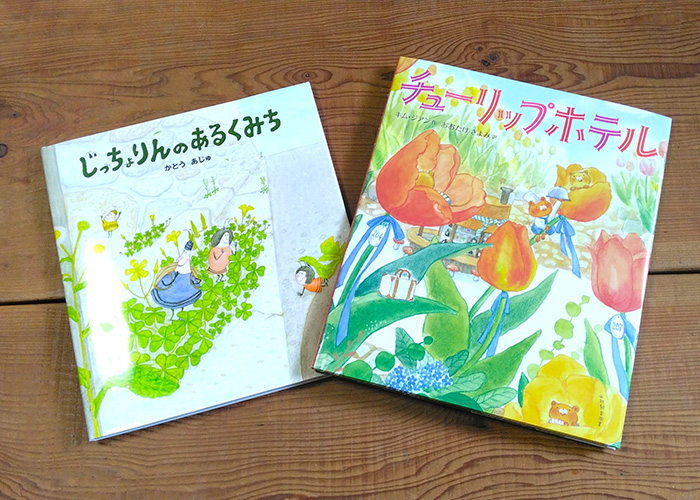 人間の気付かないところで、せっせと花の種を植えて歩く姿が愛おしい「じっちょりんのあるくみち」、5匹のカヤネズミが球根から花を育て、お客様をおもてなしする「チューリップホテル」の2冊です。