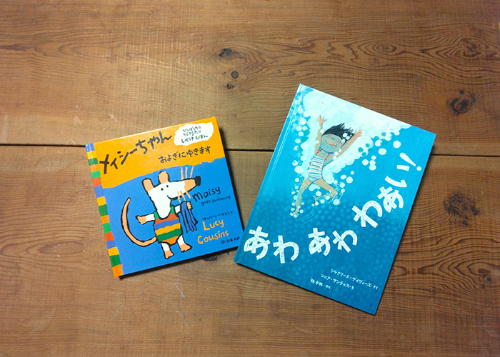 主人公が水着へ着替えるのを、読者が楽しく手伝ってあげられる”しかけ絵本”「メイシーちゃん およぎにゆきます」、おひさまの光が美しい水の中を、自由にのびのび泳ぐ女の子が魅力的な「あわ あわ わあい!」の2冊です。