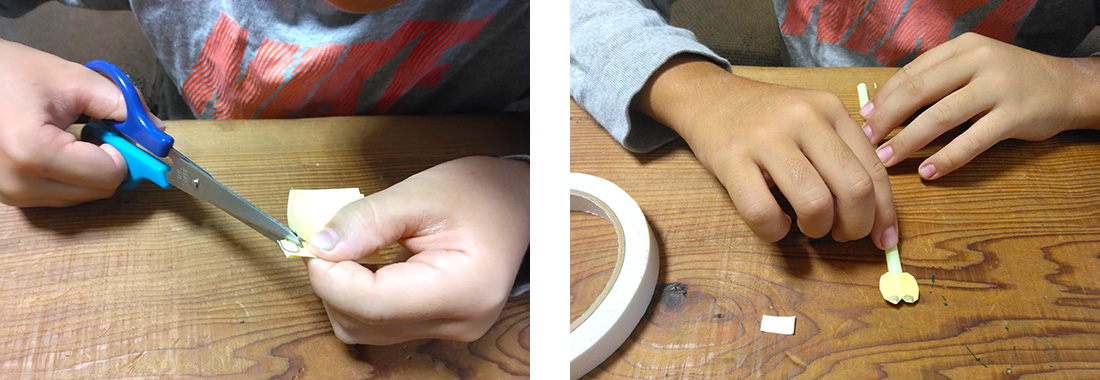 5.切り込みを入れたストローの先を、細くなるようにセロハンテープでとめます。
