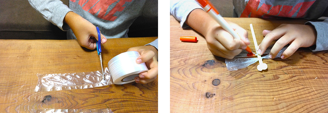 1.1本目のストローを2/3ほどでカットし、片側の穴をセロハンテープでふさぎます。