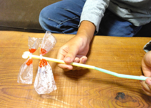 3.ビニールひもを適度な長さに2本切り、ストローに結び付け、とんぼの羽にします。