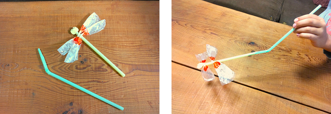 [遊び方]:2本目のストローの先からフーッと息を吹き込むと、とんぼが飛んでいきます。