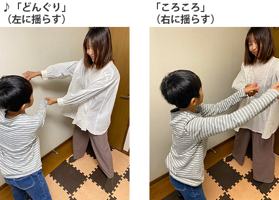 「どんぐりころころ」の歌を歌いながら、リズムに合わせて両手を左右に揺らします。