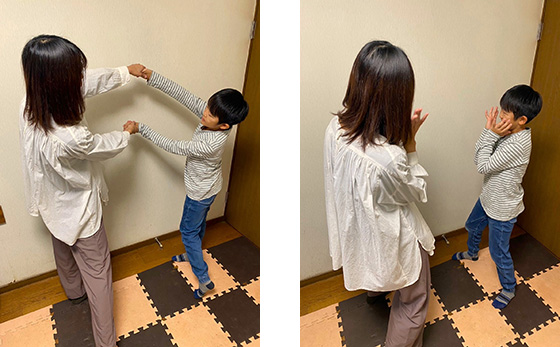はじめはゆっくり大きく腕を揺らし、リズムよく、2小節の感覚をつかむことを意識。慣れてきてスピードアップすると、私のポーズを瞬時にまねするのが難しくなってきた息子は「わぁ!」「まちがった~(笑)」などと笑いながら、一生懸命にポージングしていました。