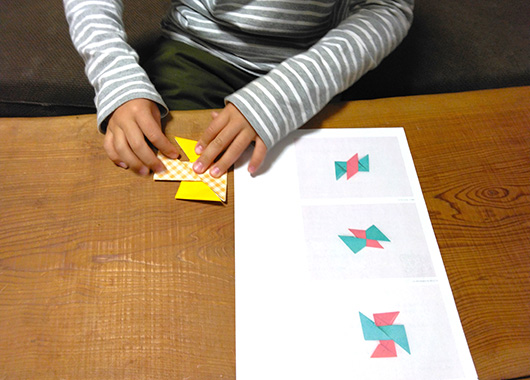 はじめは簡単な「星」などの折り図を用意し、親子で一緒にスタート。