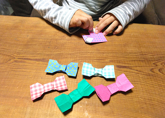 少し難しい「ハート」や「リボン」が上手に折れるようになると、「お友だちにあげる!」と色違いのものをたくさん作成。