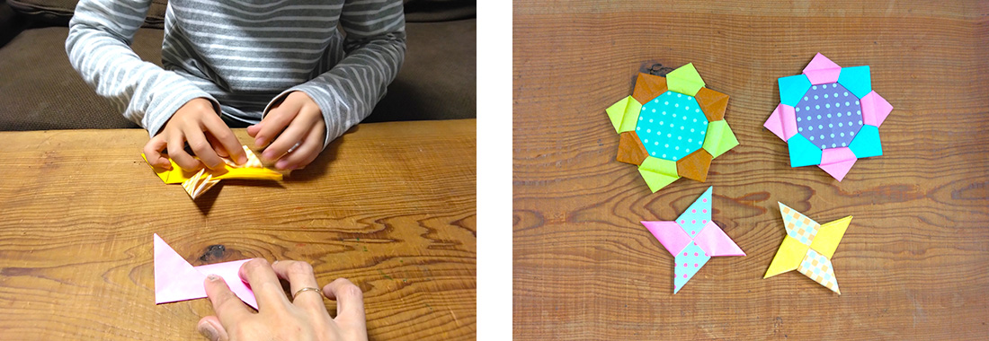 慣れてくると、2枚の折り紙を使う「手裏剣」や「お花のメダル」などにもチャレンジしていました。