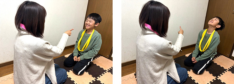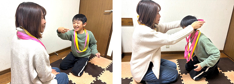 1.親子で向かい合い、レイを5個ずつ首にかけ、ジャンケンをして「あっちむいてホイ!」をします。「ホイ!」と言うときに、ジャンケンに勝った人が人さし指を上下左右いずれかに動かし、負けた人はそれとは違う方向になるように顔を動かします。