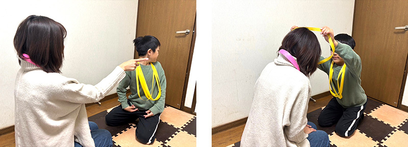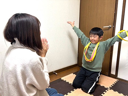 ★「あっちむいてホイ!」に負けて、相手の首にレイをかける際には、「はい、どうぞ」と言いながらかけるようにすると、レイをもらった人はうれしいでしょう。また、親子のコミュニケーションも図れます。