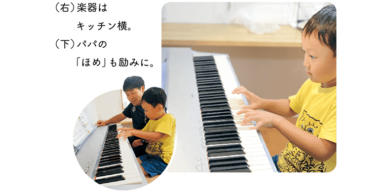 共働きで、平日はなかなか自宅練習のために声をかける時間がとれないからこそ、弾きたいときにすぐ練習できるよう、キッチン横に練習スペースを。