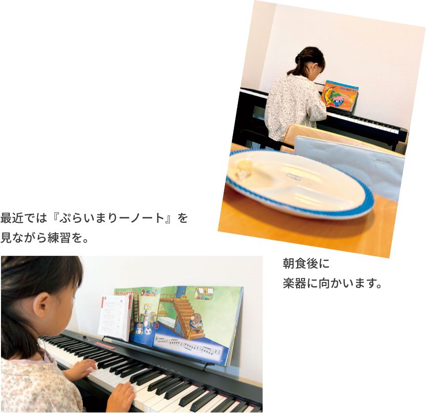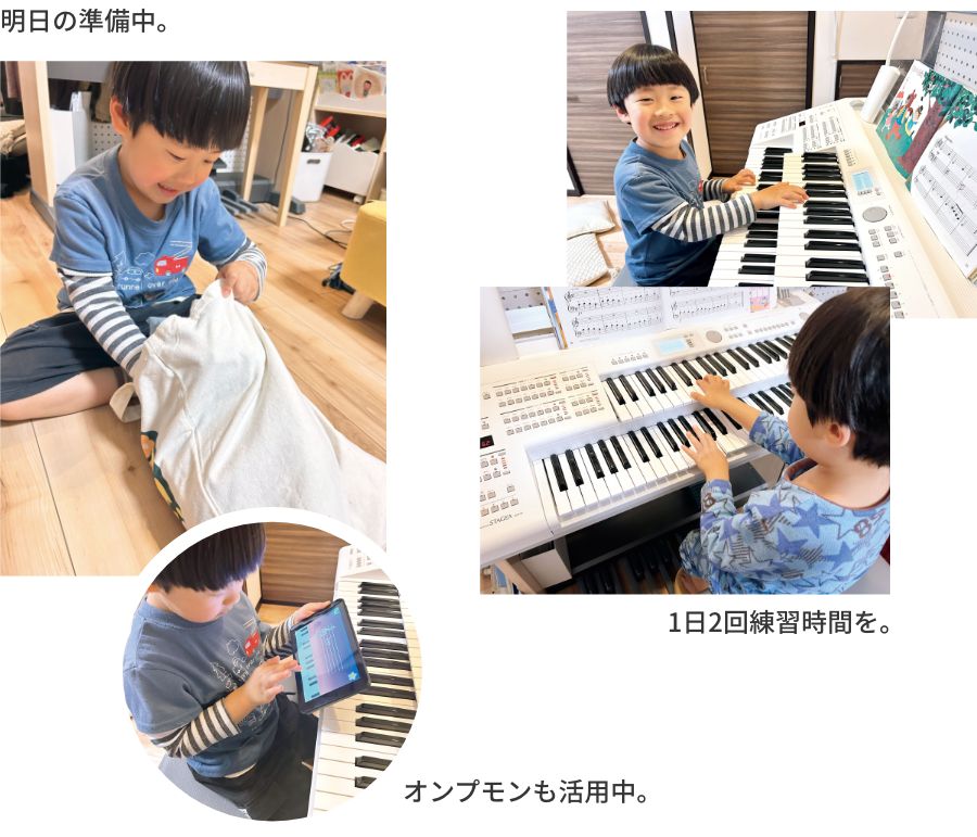 集中できるように、起床時と保育園から帰宅後の2回に分けて練習しています。「練習する?」と言うと、本人のやる気がなくなるので、「何の曲を弾く?」「○○の曲が聞きたい!」と声かけを。