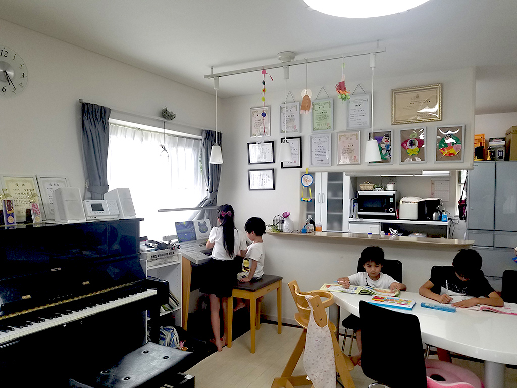 ピアノ個人レッスン(5年生)、ジュニア総合コース(2年生)、幼児科2年目(年長)、幼児科1年目(年中)の4人のお子さまがヤマハ音楽教室に通っています。